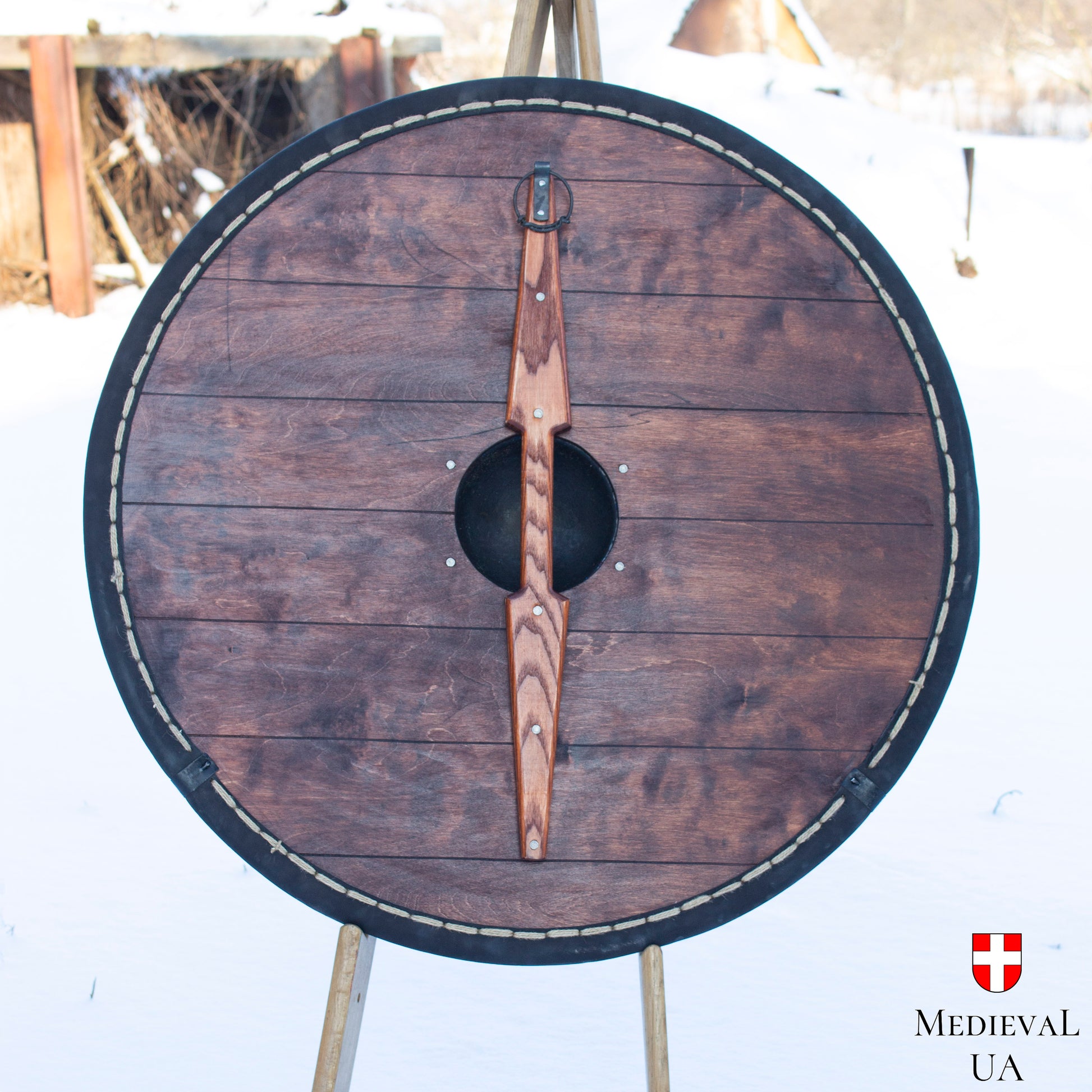 This Viking shield consists of plywood 10 mm, with a forged shield boss, covered by canvas, and the edge of the heater shield is reinforced with a 10 mm rope, 4 mm leather on the edge.